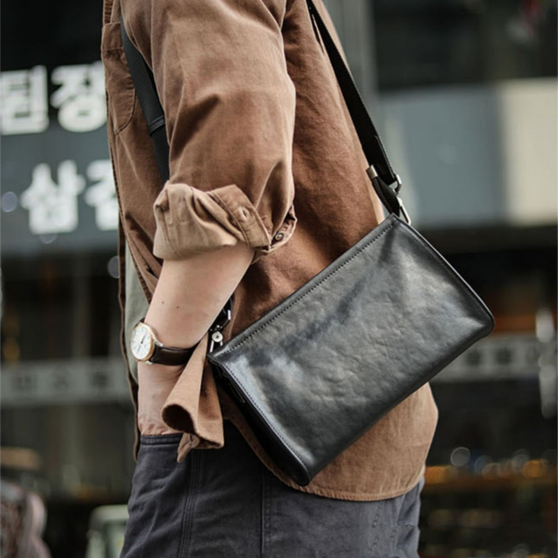 男性用トップレイヤ牛革製ショルダーバッグ。コンパクトなサイズでもものをけっこう収納できます。太めベルトとストラップベルトが2本付いており、取り外しできますので、ショルダーバッグやハンドバッグとしてもお使いいただけます。高品質なトップレイヤ牛革を採用し、シンプルで長く使えるタイプです。