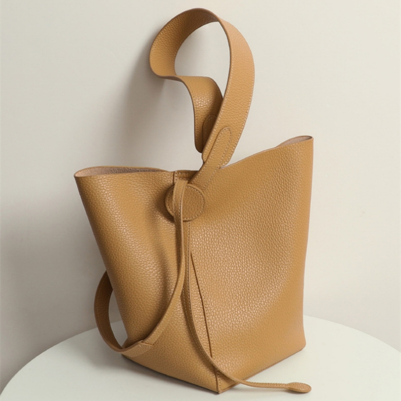 本革素材のバケツ型トート・ショルダーバッグ。台形のシルエットが特徴で、開口部が広くて収納性に優れています。シンプルなラインデザインが目立たず、「クワイエットラグジュアリー」なスタイルを表現。シボ加工された本革素材を使用することで、「ソフトだけど型崩れしにくい」「肌触りが良く日常で使いやすい」という特長がある。中には取り外し可能なポーチ付きで細かい荷物もまとめてしまえる。大きすぎず、日常使いのしやすいバッグです。